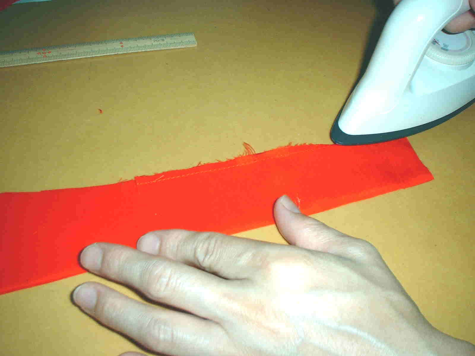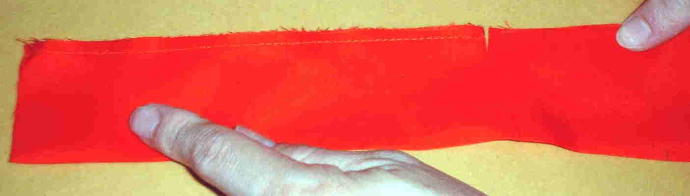 広げて背縫い部分にアイロンをかけて縫い代を落ち着かせる。 前身ごろと後ろ身ごろを合わせて脇縫い止まり位置まで縫う。