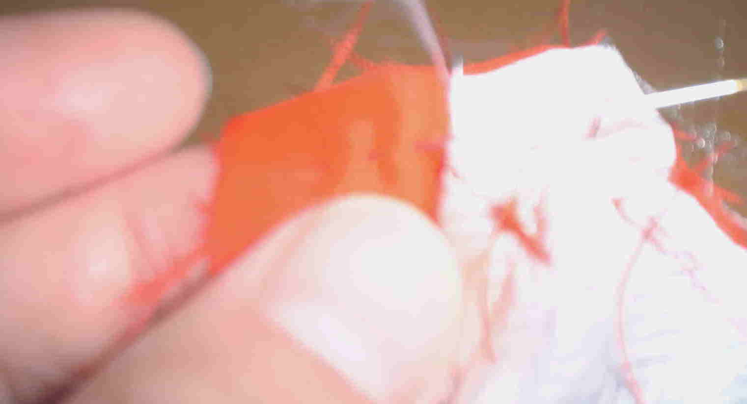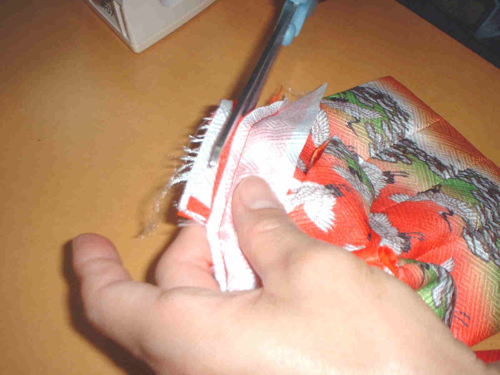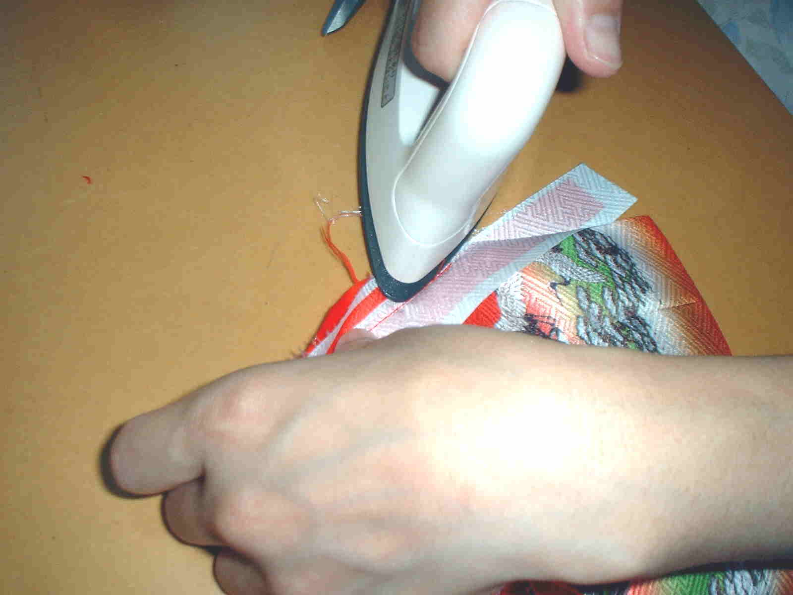 角の縫い代を持ち裏返す。角が出にくいときは針等を使用し、きれいに形を整える。