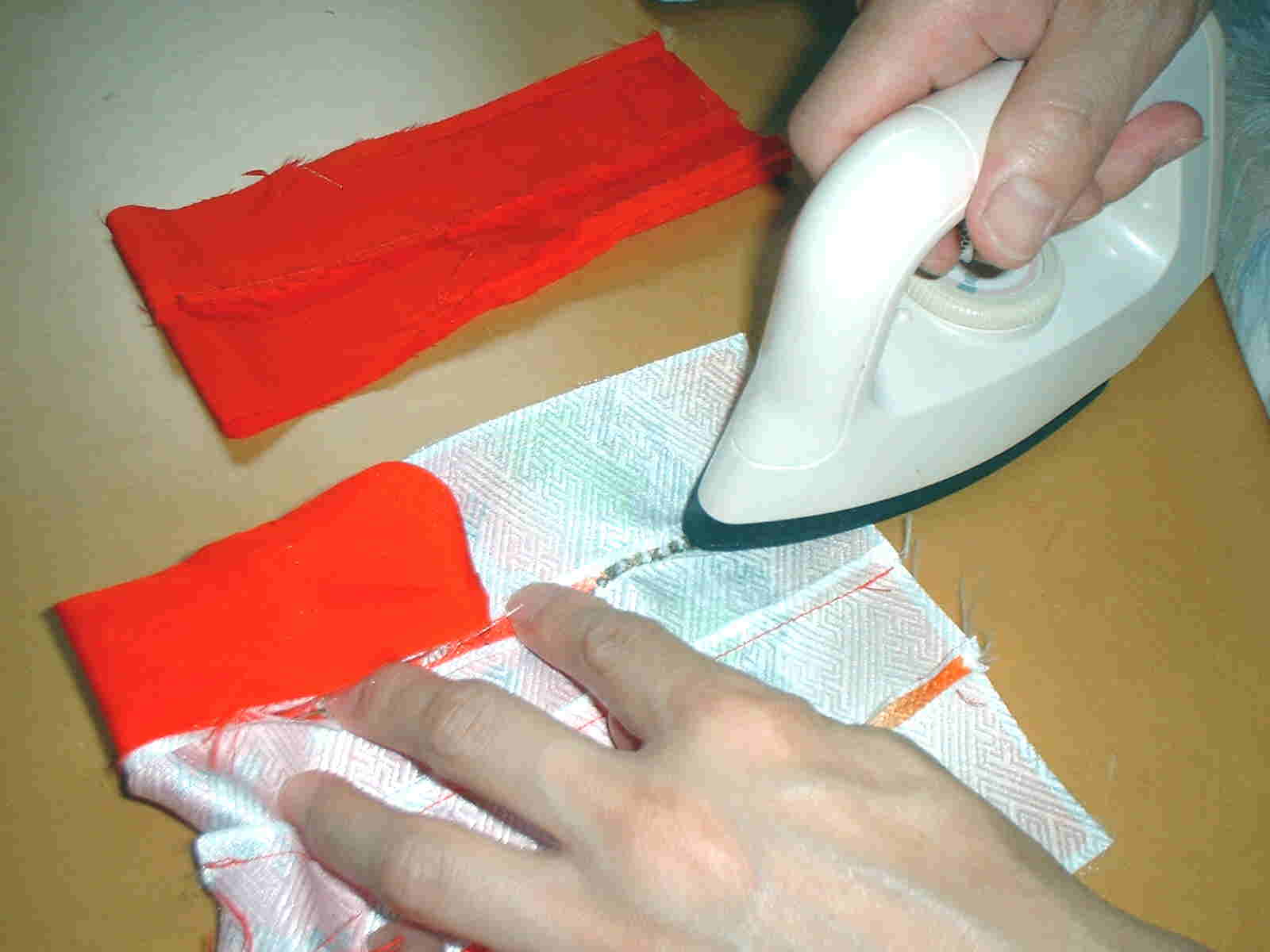 裏地と表地を中表に合わせ、えり下から裾にかけて縫う。 縫い代を表地側にえり下・裾の順に折り、アイロンをかける。