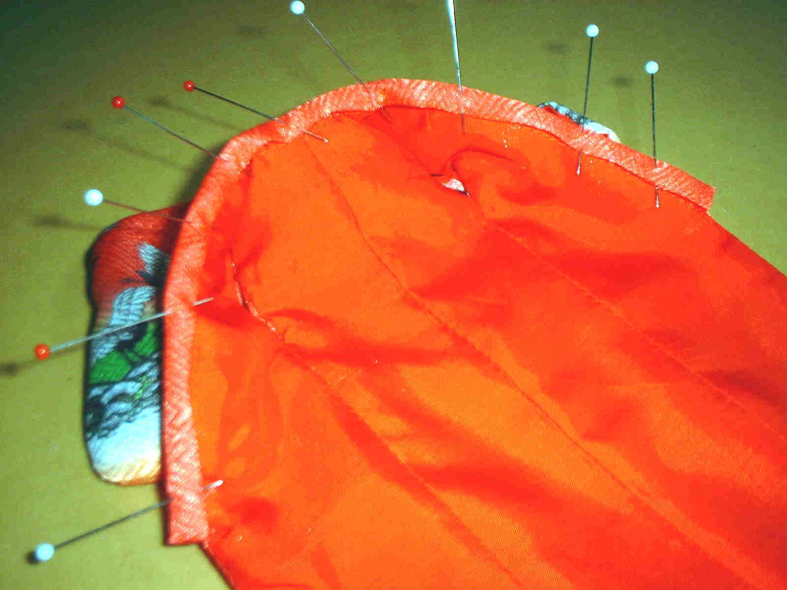 背縫い。 えり肩あきの位置に気をつけて待ち針を打つ。
