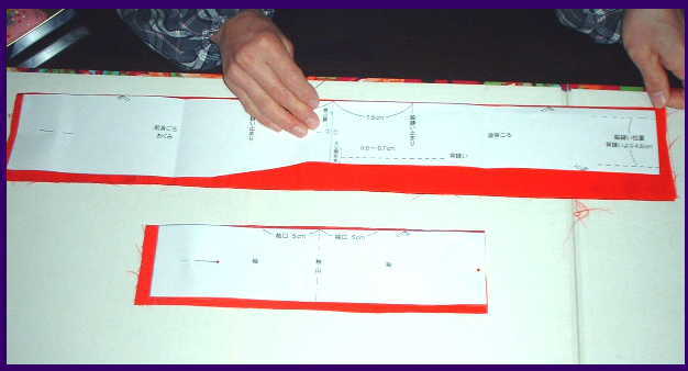 裏地の小さいほうを、半分に折りアイロンかける。 型紙を裏地の上にのせ待ち針で止める。