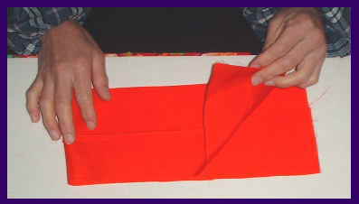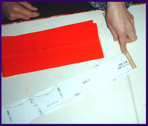 前身ごろと、後身ごろを中表に合わせる。 型紙で寸法の確認
