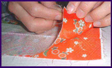 表地と裏地を合わせて、前袖側に縫い代を倒し、アイロンをかける。 表地の、振り部分の縫い代を折りアイロンをかけておく。
