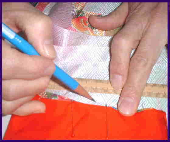 脇の位置をあわせ、待針を打つ。 脇縫い止まりの位置の確認。