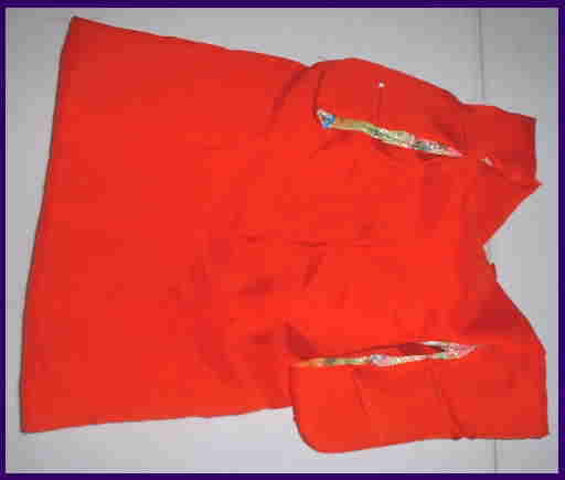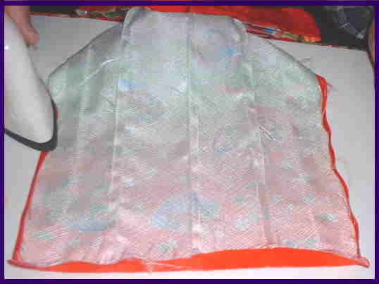 表地側に縫い代を倒し裾、えり下の順にアイロンをかける。 ひっくり返し、袖を裏地にとおす。