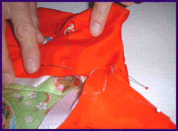 裏地の身ごろと袖を縫い、身八っ口の表地と裏地を、縫い合わせる。
