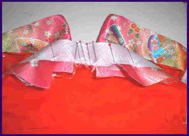 えり下の長さを合わせて、平になる様において、えりの待ち針を打つ。 えりを針で手縫いの場合は、なるべく細かく縫い、