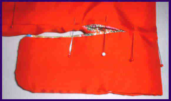 えり肩あきの部分は、しっかりと直角になる位に開いて細かく待針を打つ。おくみ先の位置で待針を打つ。