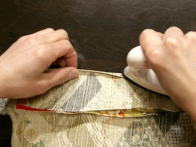 | 縫い目にアイロンをかける。 | 左手側に後身ごろ、右手側に前身ごろを置き、縫い代を 縫い目で手前に折、アイロンをかける。 |