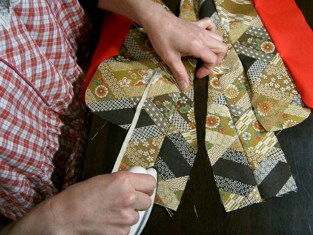 | 表からも軽くアイロンをかける。 | 袖口・袖付け・背縫い・おくみを縫い合わせたところ。 |