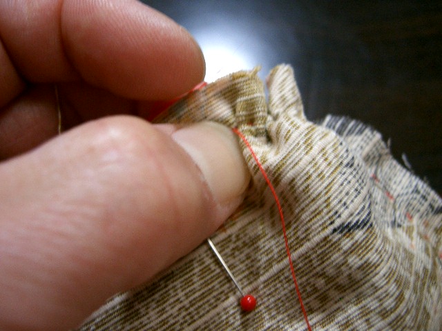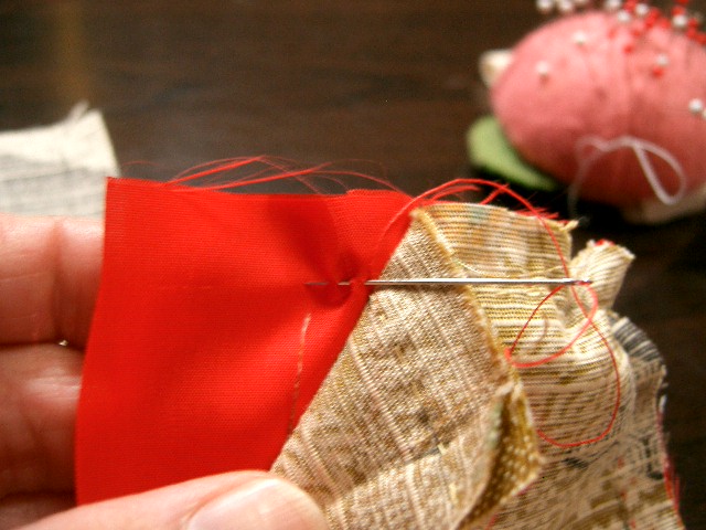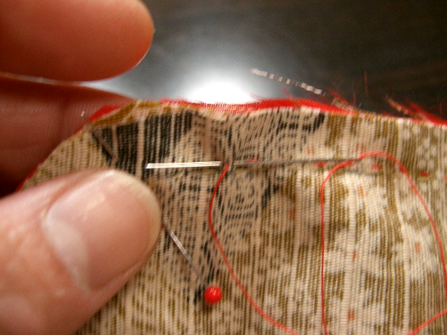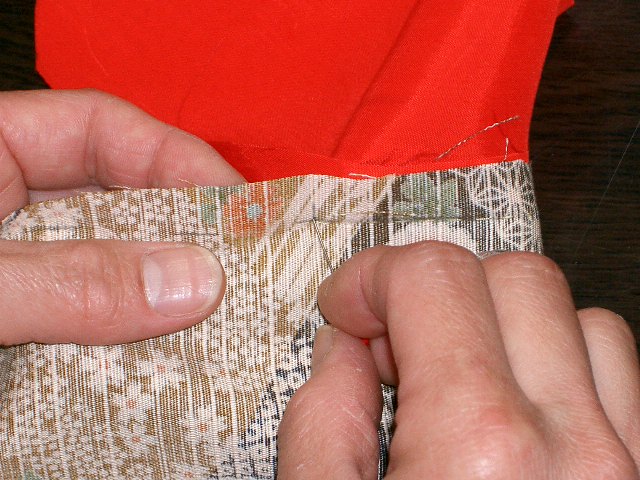 | 脇を合わせ、身八つ口から裾の縫い代までなるべく 細かい針目で縫う。 |