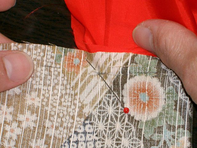 | 表生地の袖の振りを出来上がりで折り、アイロンを かける。裏地は少し控えて折り、待ち針で止める。 |