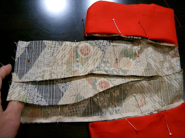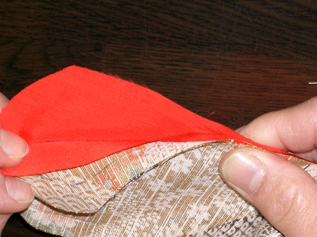 裏地を2枚一緒に袖口のところで折、後袖側に合わせる。 前袖・後袖・裏地後袖・裏地前袖の順に4枚重なる。 中側に入った2枚は縫い代を自然に斜めに折り消す。 |
