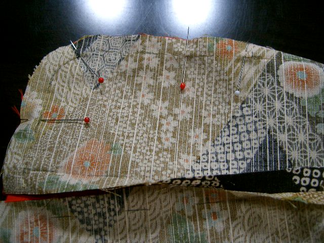 | 前身ごろとおくみ印で合わせ待ち針を打つ。裾は縫い代まで、 おくみの先(剣先)はおくみ付け止まりの位置、印どおりに縫い 止まる。 |