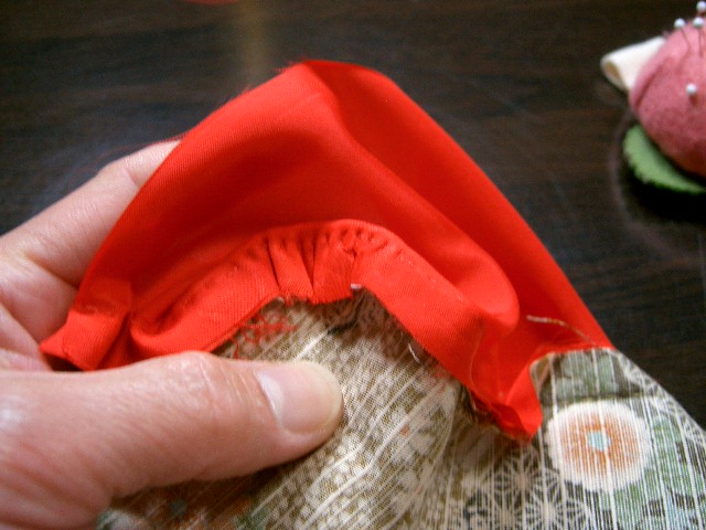 | 袖が4枚重なったところ | 袖口下を4枚合わせて縫う。この時、表生地の縫い目のすぐ上 (縫い代側)で縫い合わせる。 |