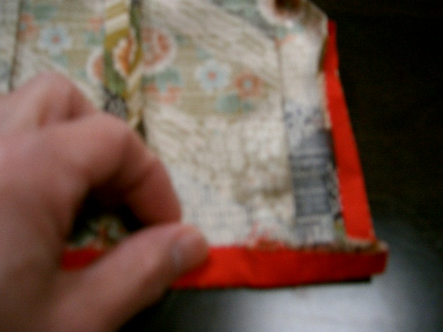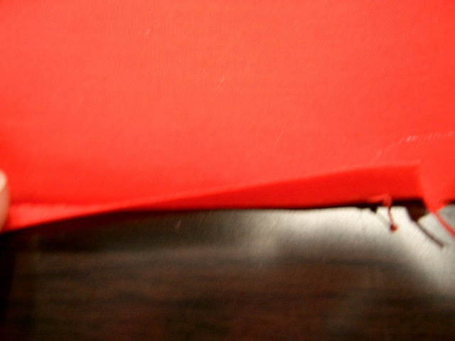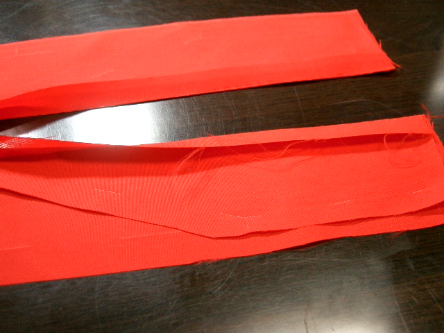 | 脇縫い代は割る。 | 表生地と裏地を中表に合わせる。背縫いの位置で 印の位置にずれが無いか確認する。ずれがあった 時は表生地の印を基準にし裾の印をつけ直す。 |
