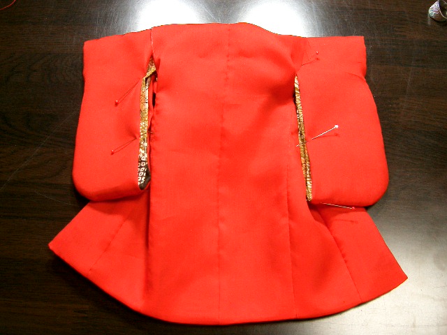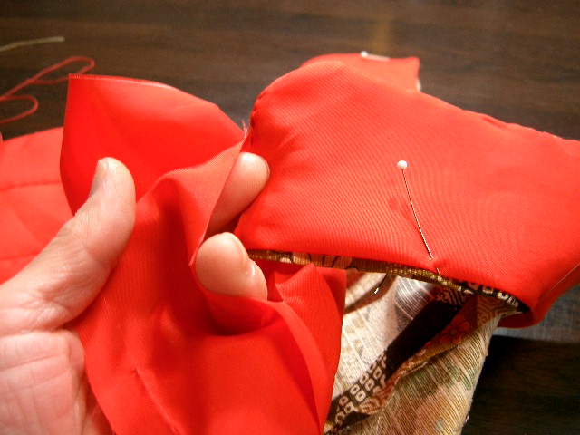 | 身ごろの表生地と裏地が動かないように、背縫い・脇・おくみで 形を整えて待ち針を打つ。身八つ口は裏地を少し控えて合わせ 肩山部分では身ごろの縫い代を自然に伸ばし、袖の縫い代を 折ってかぶせとじ合わせる。袖の振り部分も一緒に閉じる。 |