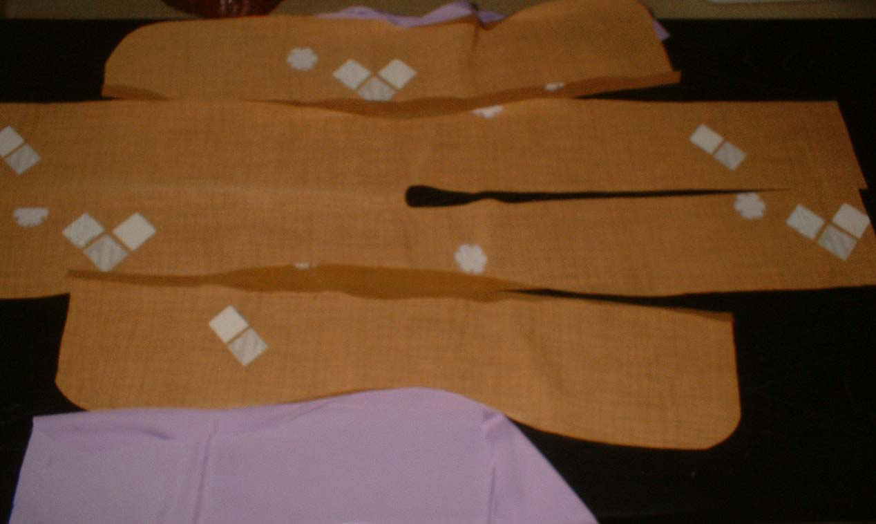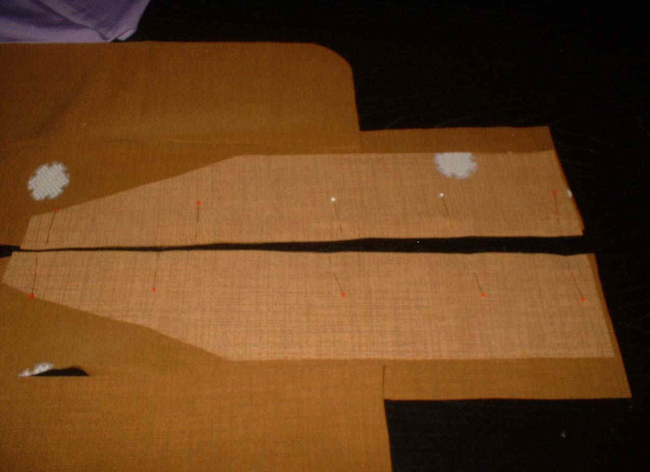 (10)前身ごろに、おくみを中表に合わせ、おくみ先は印で縫い止まり。