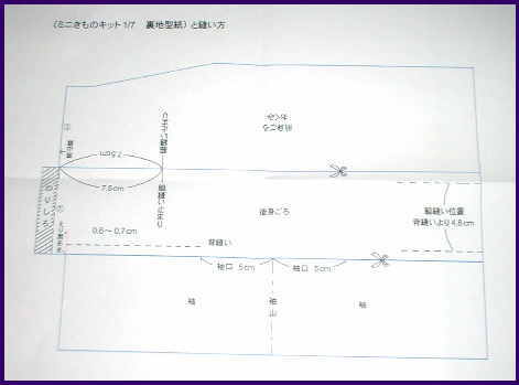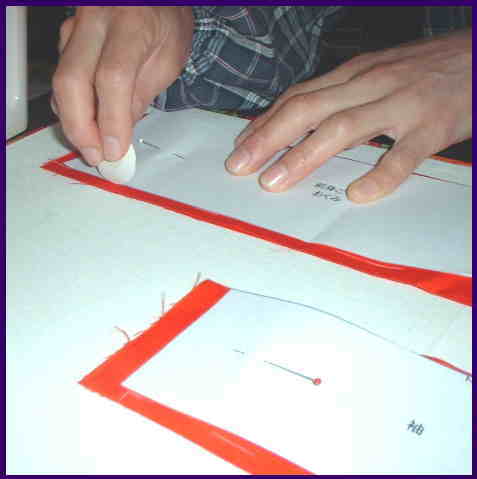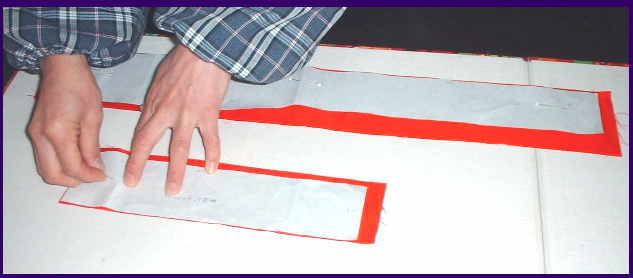 裏地の小さいほうを、半分に折りアイロンかける。 型紙を裏地の上にのせ待ち針で止める。