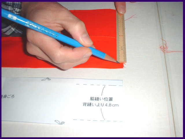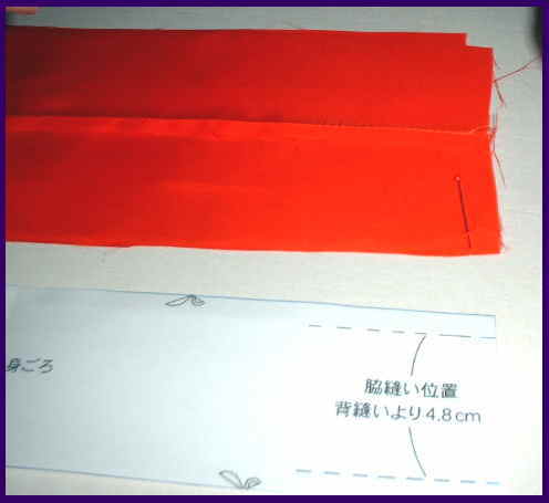 背縫いより、4.8cmの所に印つけか、待針を打つ。 脇縫い止まり位置に印をつける。