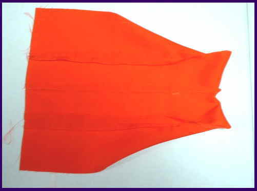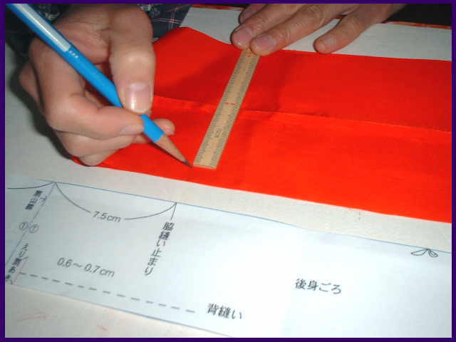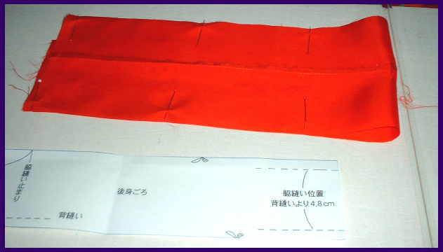 前身ごろと、後身ごろを中表に合わせる。 型紙で寸法の確認