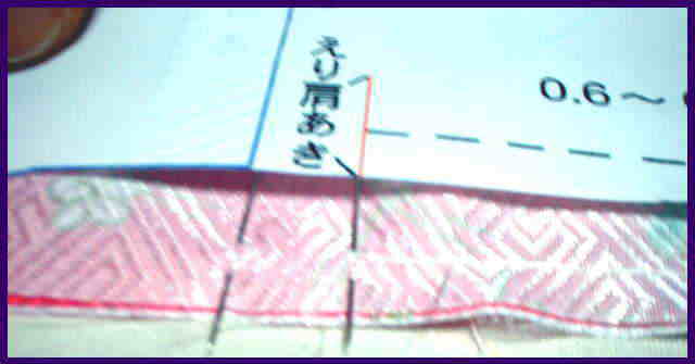 おくみと前身ごろE、F おくみと前身ごろにある、白い線を基準にして待針を打つ。