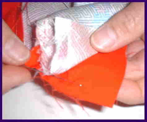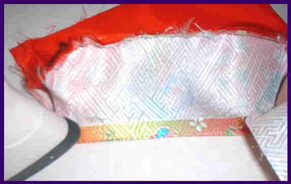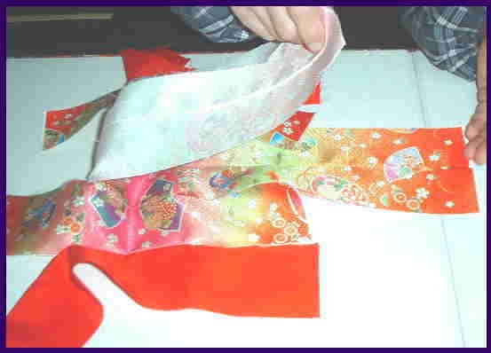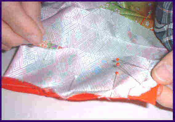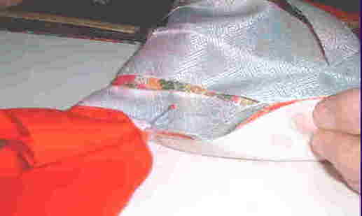振り部分の、表地と裏地を縫う。 脇縫い B、C
