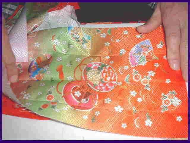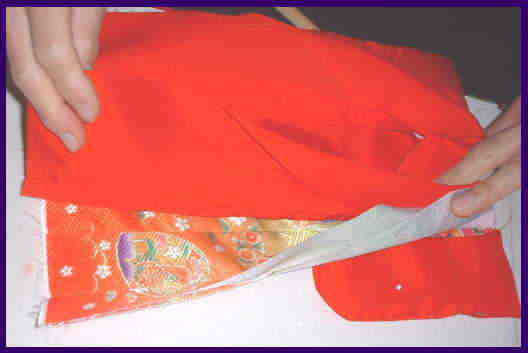 表地側に縫い代を倒し裾、えり下の順にアイロンをかける。 ひっくり返し、袖を裏地にとおす。