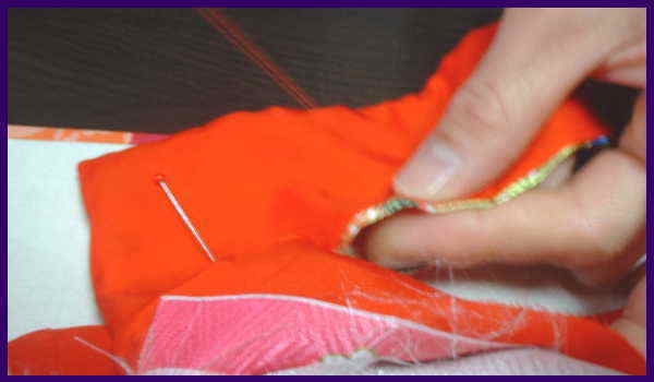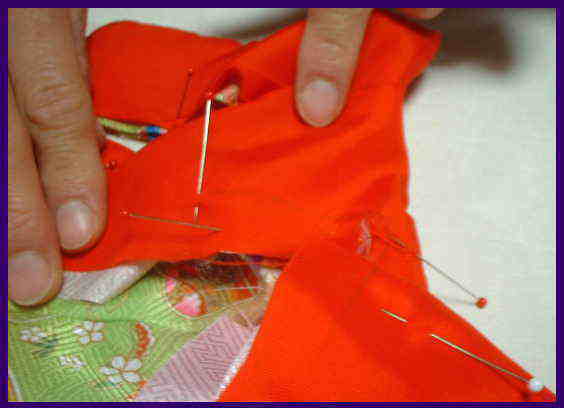 えり下の長さを合わせて、平になる様において、えりの待ち針を打つ。 えりを針で手縫いの場合は、なるべく細かく縫い、